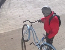 On January 15, 2026, at about 2pm a robbery occurred at Citibank on Howe Ave. The suspect approached the bank teller, stated he had firearms and demanded money. The suspect displayed a black handgun that was inside a black backpack. The suspect exited the bank with an undisclosed amount of money and fled on his sky blue beach cruiser with a white seat and black handle bars heading westbound on Fair Oaks. The suspect was last seen on the American River Bike Trail. The suspect is a white male adult wearing a grey hooded sweatshirt with a red zip jacket with a black covid mask, black gloves, black pants with grey black stripe down side, black shoes and carrying a black backpack with Orange Nike Logo on the back. Wanted as of 01/23/2026