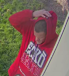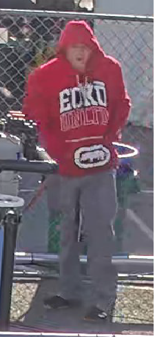 On 1/20/2026 the suspect damaged the electrical panel and attempted to steal heavy gauge copper wire. During the early morning hours, he enters Garden Valley and responds to the temporary lunch room/tent located on the playground black top. The suspect is wearing a black hooded sweatshirt with a large distinctive smiley face. On 01/10/2026, the suspect accessed a fenced off area of the Garden Valley Elementary School grounds and stole lighting equipment and wiring connected to the HVAC systems. The suspect is a White male adult with buzzed blond hair, wearing a red “ECKO” Unlimited Hoodie, grey sweatpants, and black shoes. He was clean shaved with a pronounced nose. All picture appear to be the same suspect. He could be an unhoused person in the area. Wanted as of 01/23/2026